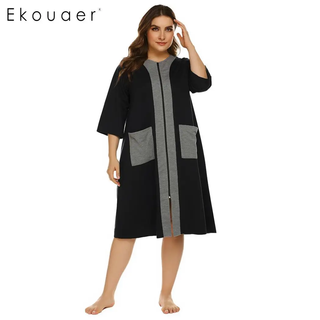Ekouaer Plus Size Nightgown Women Half Sleeve Zipper Robe Pockets