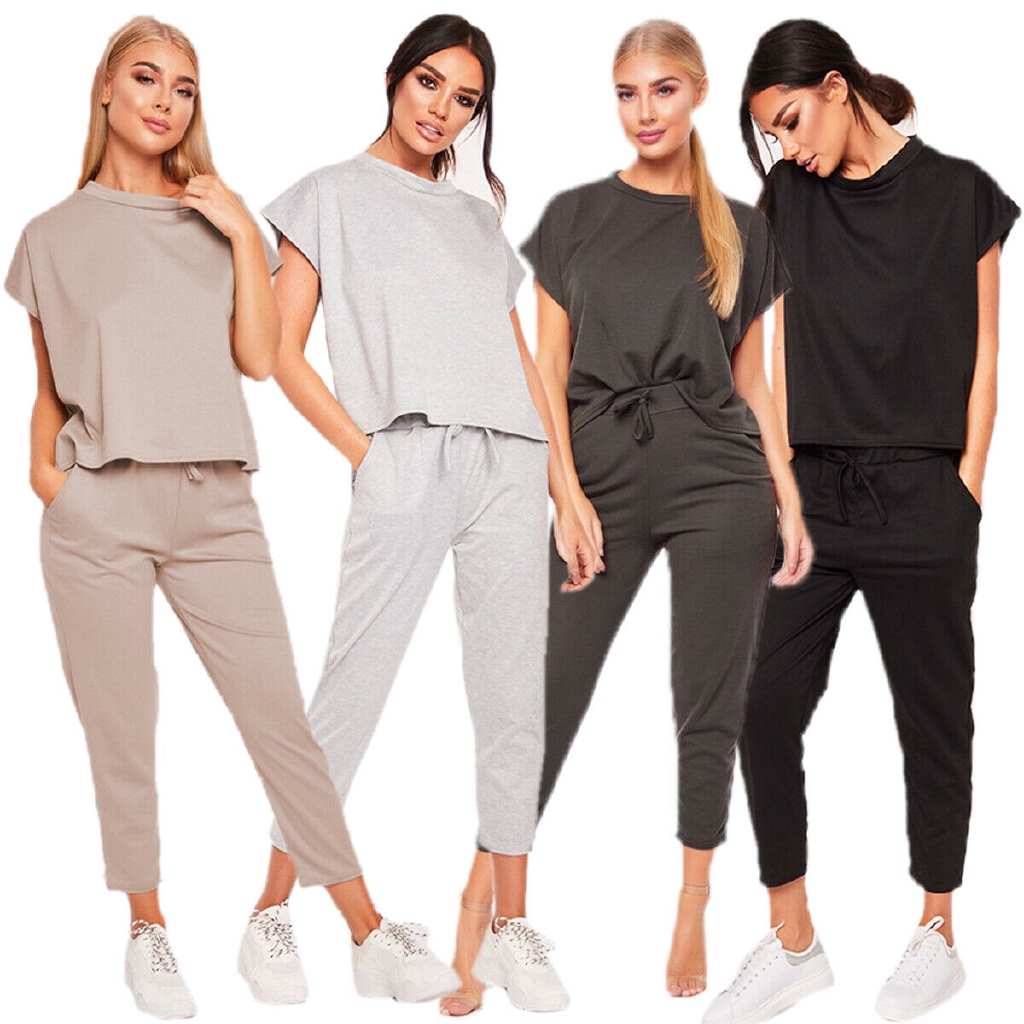 2pcs Women Summer T Shirt Jogger Pants Sports Set Plain Casual