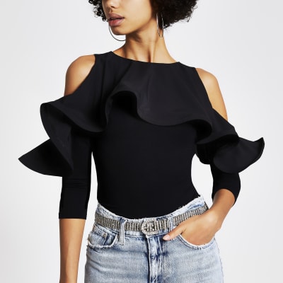 Black Cold Shoulder Long Frill Sleeve Top River Island